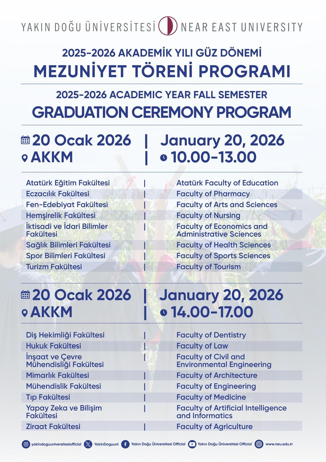 Mezuniyet töreni provası, 16.01.2026 Cuma günü saat 11.30’da AKKM’de, her fakültenin, yüksekokul ve meslek yüksekokulun mezuniyet töreni komisyonu temsilcileri ve öğrencilerin katılımıyla gerçekleştirilecektir.